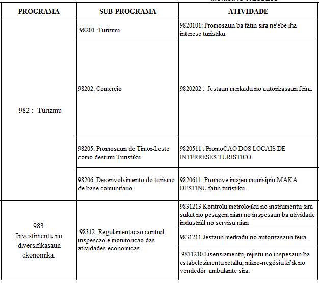 Bazeia ba Planu Asaun Anual Servisu Munisipal Jestaun Merkadu no Turizmu iha Programa 2 , Sub- Programa 5 , Atividade 7 . Hare’e detallu iha Tabela :