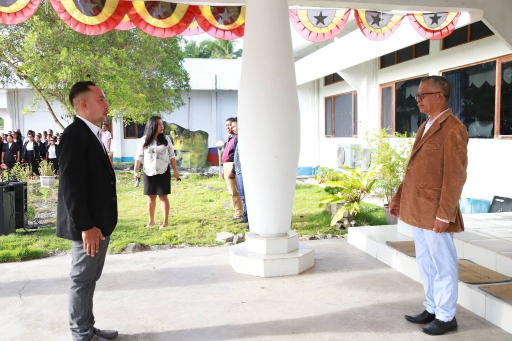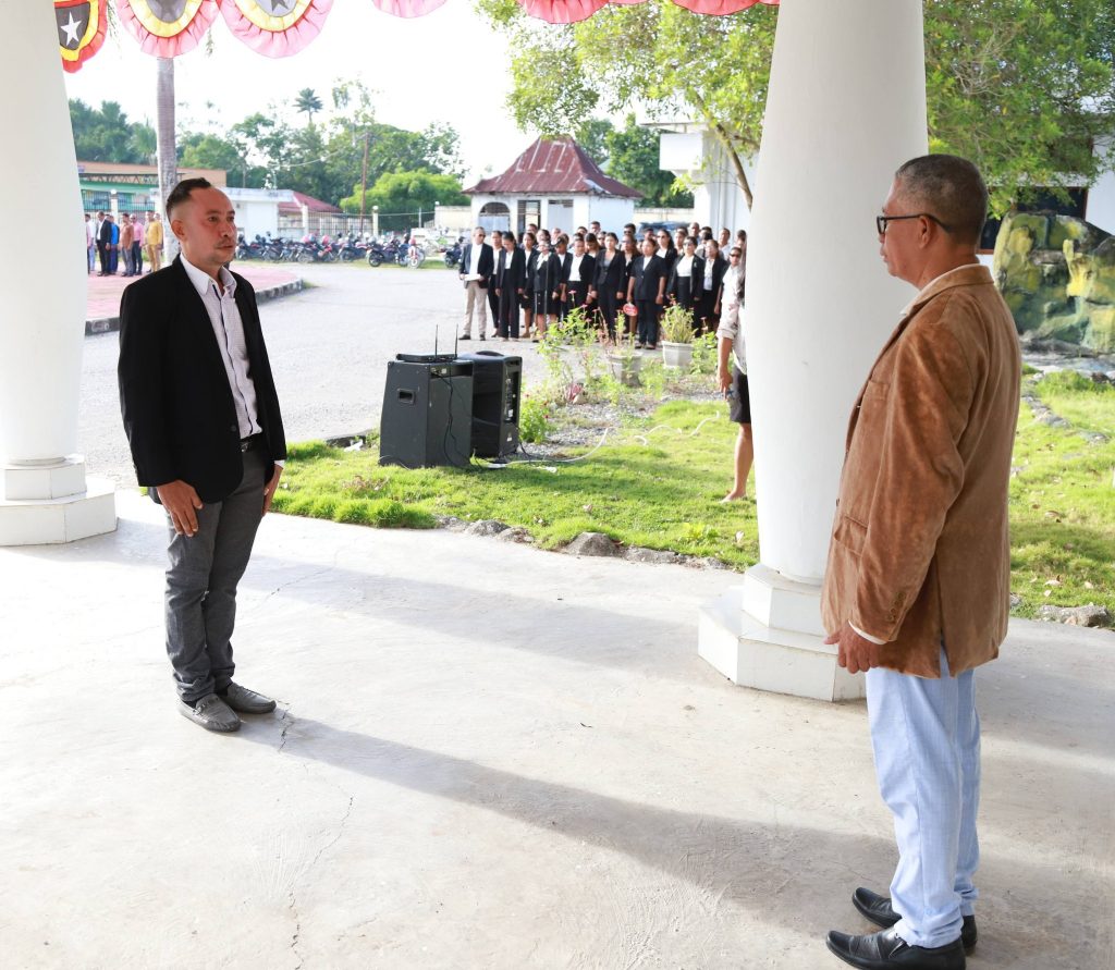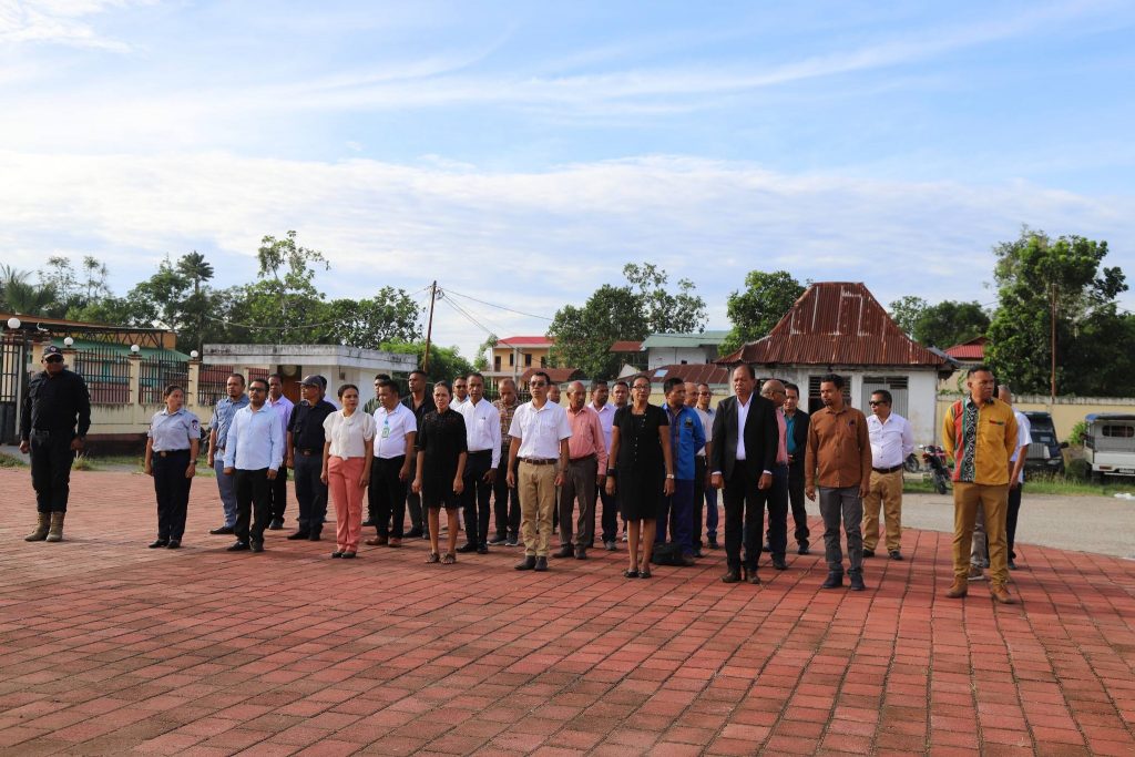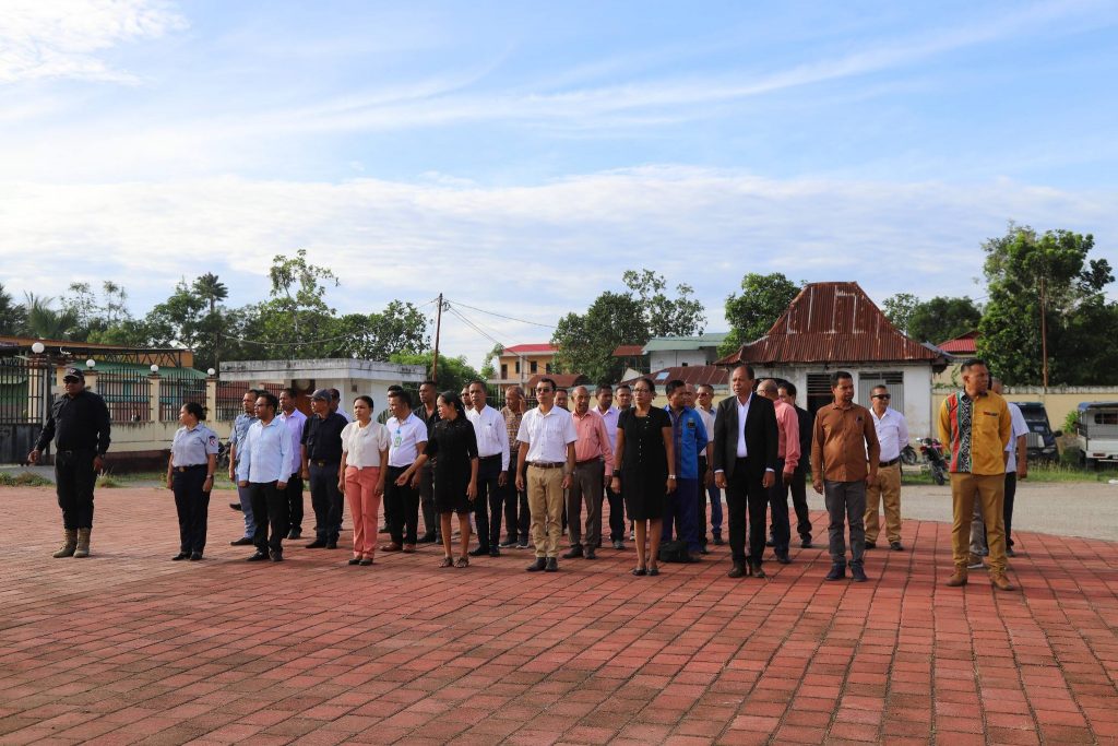 Viqueque, 02 Fevereiru 2026, Exelénsia Sekretariu Munisipál Asuntu Planeamentu Investimentu no Dezenvolvimentu Integradu (PIDI), Sr. Acacio Sarmento, hetan delegasaun husi Exelénsia PAM, nu’udar inspetór serimónia isár bandeira nasionál, primeira semana, fulan fevereiru tinan 2026, iha resintu edefísiu Administrasaun Munisipál Viqueque.