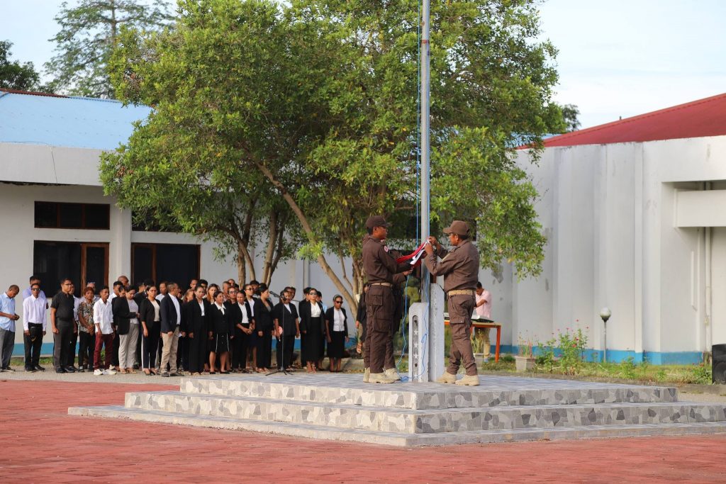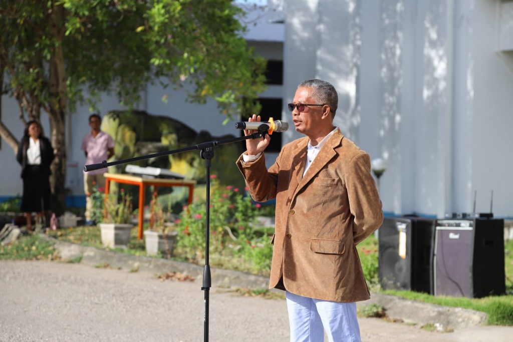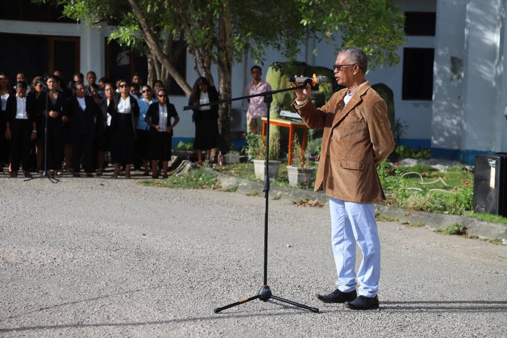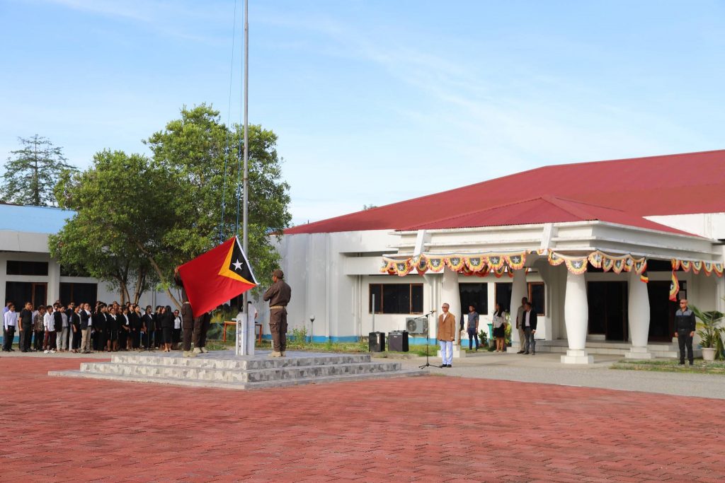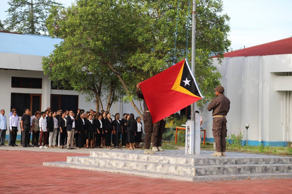 Viqueque, 02 Fevereiru 2026, Exelénsia Sekretariu Munisipál Asuntu Planeamentu Investimentu no Dezenvolvimentu Integradu (PIDI), Sr. Acacio Sarmento, hetan delegasaun husi Exelénsia PAM, nu’udar inspetór serimónia isár bandeira nasionál, primeira semana, fulan fevereiru tinan 2026, iha resintu edefísiu Administrasaun Munisipál Viqueque.